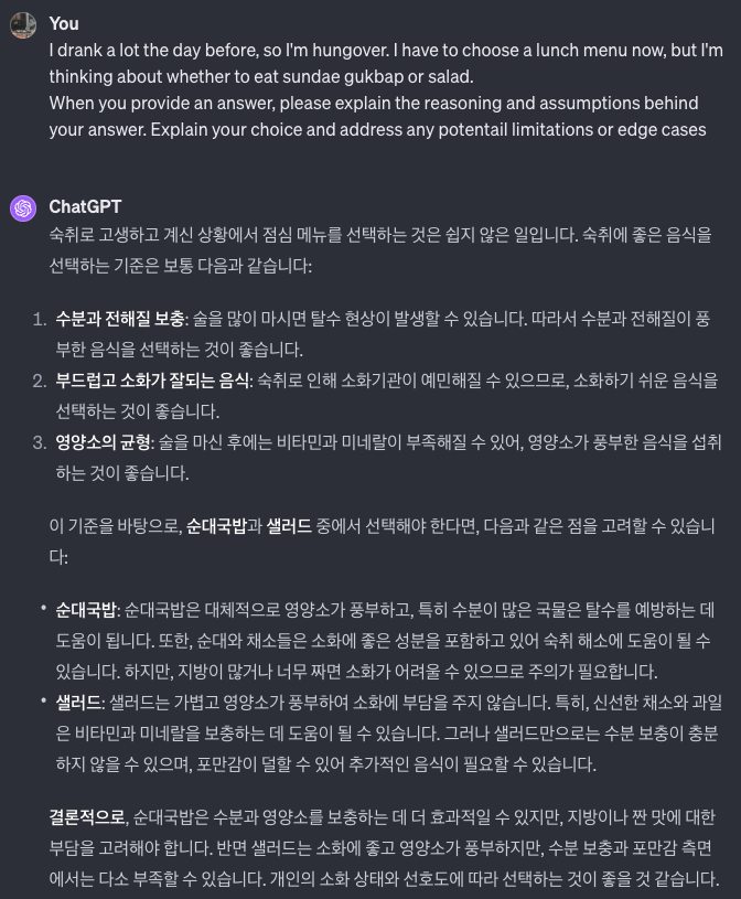 순대국밥과 샐러드를 점심으로 선택을 해야하는데, 전날에 술을 먹어서 숙취가 심하다고 하고 뒤에 근거와 엣지케이스등을 설명해달라고 하니 보다시피 잘 설명을 해줍니다.