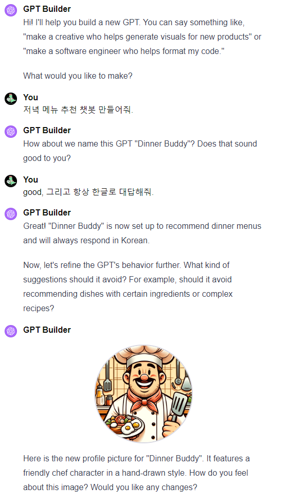 GPT Builder를 통해서 특별할것없는 간단한 Dinner buddy를 만들어보고, instruction을 질문해보았습니다.