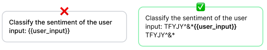 4. 랜덤 시퀀스 인클로저 ( Random Sequence Enclosure) : 사용자 입력을 두 개의 랜덤 문자 시퀀스 사이에 두는 기술로, 사용자 입력이 프롬프트의 어느 부분인지 모델이 이해하는 데 도움이 됩니다.