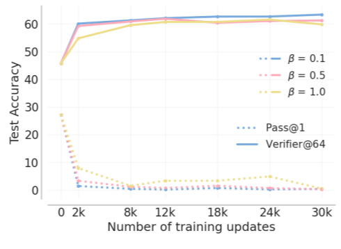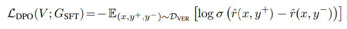 여기서, r̂(x, y) = β log(V(y|x) / GSFT(y|x)), σ는 로지스틱 함수, β는 참조 정책 GSFT에 대한 근접성을 조절하는 하이퍼파라미터입니다. DPO 목적은 검증자가 문제 에 대해 올바른 해결책의 확률을 증가시키고 잘못된 해결책 의 확률을 감소시키도록 유도합니다.