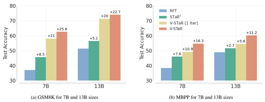 이 논문 V-STaR에서는 정답과 오답을 모두 활용하는 방식을 도입합니다. 생성된 해결책의 정답 여부를 판단하는 검증자(Verifier)를 DPO(Differential Privacy Optimization) 기법을 사용해 학습합니다. 이 Verifier는 추론 시 여러 후보 해결책 중 최적의 해결책을 선택하는 데 사용됩니다. V-STaR를 반복 실행함으로써, 점차 개선된 문제 해결자와 검증자를 얻을 수 있으며, 이는 코드 생성문제(MBPP) 와 수학 추론문제(GSM8K) 벤치마크에서 기존 방법보다 4~17% 까지 정확도를 향상시키는 결과를 보여줬습니다.