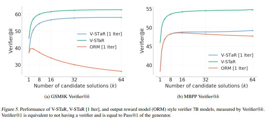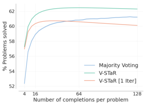마지막으로 V-STaR는 정확한 및 부정확한 해결책을 활용하여 강력한 검증자를 훈련하는 데이터 효율적이고 구현이 간단한 방법 이라고 하며 한번 더 정리하고 있습니다