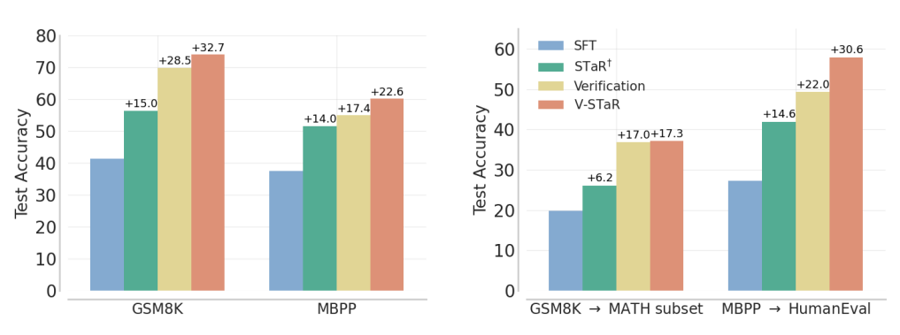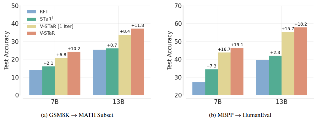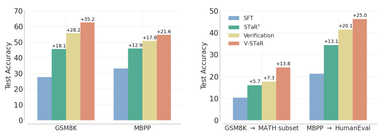 이 섹션에서는 V-STaR의 효과를 보여주기 위해 GSM8K(수학 문제 해결)와 MBPP(코드 생성) 데이터셋에서의 실험 결과를 소개하면서, Hendrycks’ MATH와 HumanEval을 사용하여 V-STaR의 전이 일반화 성능도 평가했습니다.