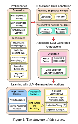데이터 주석은 데이터의 복잡성, 주관성, 다양성으로 인해 도메인 전문 지식을 필요로 하며, 대규모 데이터셋을 수동으로 라벨링하는 것은 높은 리소스가 요구됩니다. 그렇기에 GPT-4, Gemini, Llama-2와 같은 고급 대규모 언어 모델(LLM)은 데이터 주석을 처리하는 방법론들이 발달하고 있습니다. 이러한 모델들은 주석 작업의 자동화, 대규모 데이터에서의 일관성 보장, 특정 도메인에 대한 세밀한 조정 또는 프롬프팅을 통한 적응 능력을 통해 전통적인 주석 방법에 비해 리소스를 상당히 줄여줍니다.