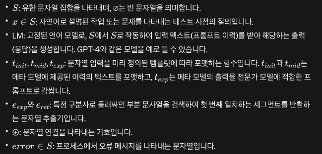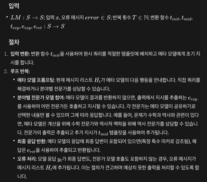 사용자가 제공한 질문으로 초기화된 이후, (a) 메타 모델을 위한 주입된 지시, (b) 지금까지의 전체 역사를 바탕으로 프롬프트된 메타 모델의 출력, 그리고 (c) 메타 모델에 의해 생성된 지시만을 바탕으로 프롬프트된 전문가의 출력(신선한 눈으로)을 통해 엔트리가 순환하는 메타 프롬프팅 역사를 보여줍니다. 전문가 모델은 사실상 자체이지만, 새로운 지시를 통해 다양한 기능을 수행합니다. 이 기능들에는 이전 출력에 대한 비평, 특정 작업을 위한 특정 인물 선택, 생성된 내용의 정제, 그리고 최종 출력이 실질과 형식 모두에서 원하는 기준을 충족하도록 보장하는 것이 포함됩니다.