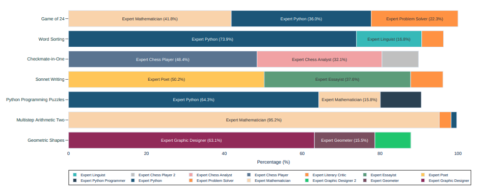 메타 프롬프팅은 특정 작업 요구에 맞춰 다양한 전문가 유형을 동적으로 선택합니다. 파이썬 인터프리터 사용 시 기술적, 계산적 전문성을 선호하며, 파이썬 전문가 없이는 디자인과 기하학 같은 시각적 문제 해결에 초점을 맞춥니다. 이는 메타 모델이 작업의 요구에 따라 전문가 참여를 맞춤화할 수 있음을 보여줍니다.
