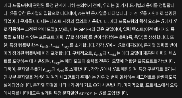- 운영 효율성: 메타 프롬프팅의 순차적인 (선형적인) 처리 방식은 시스템의 속도와 효율성에 영향을 미칩니다. 이는 동시 처리의 가능성을 제한합니다.