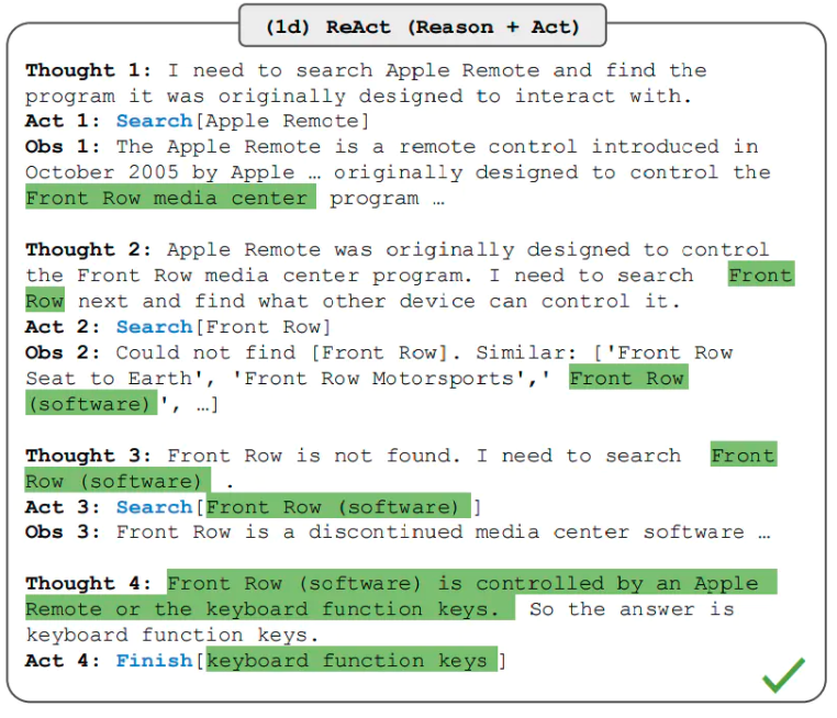 질문에 관련된 생각을 하고, 또 무엇을 찾아보고 고민하고 다음을 찾고, 그 결과를 분석하고 또 생각을 하는 prompt 입니다. 원인 분석과 행동을 하는 퓨삿 프롬프트를 모델에게 알려주어서 생각하고 행동 추론과정을 거칠 수 있게 하는거라고 생각하면된다.